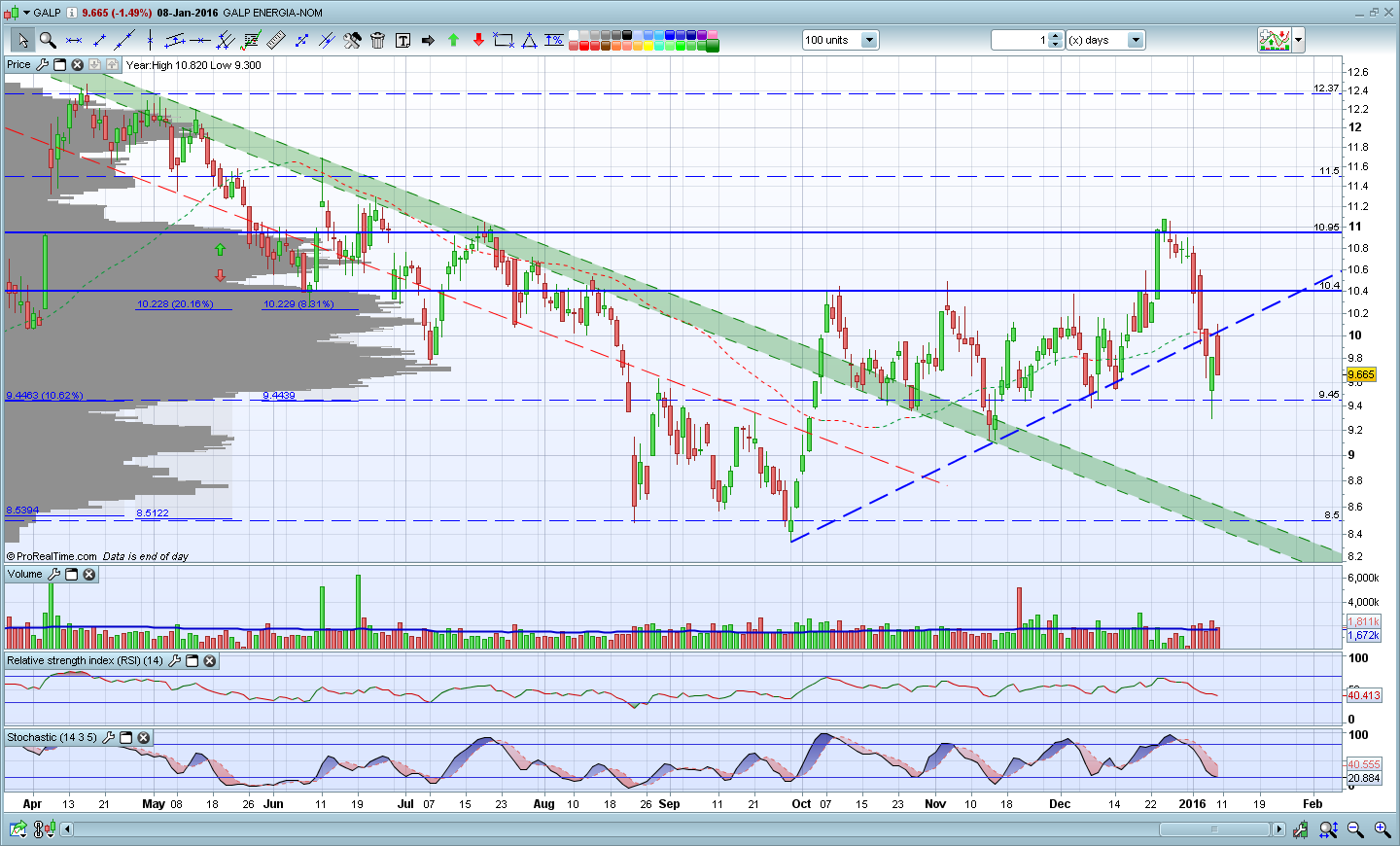 Pois, eu estou a prever uma queda ate aos 9,40 mais pelo receio da economia chinesa, pelo o Executivo de Dilma e o pacote de medidas de estímulo até ao fim do mês e este dumping da OPEP que não ha meio de acabar, apesar de quando se compara o grafico do brent ao da cotacao da Galp, o comportamento da Galp não é igual. Provavelmente vou esperar durante esta semana a ver o comportamento.