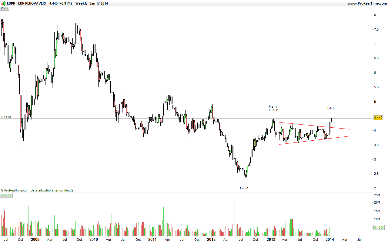 No diário a resistência estava nos 4.36€. Com 3 fechos a valores superiores, na minha opinião, a resistência foi quebrada com alguma consistência. Se vai subir desde já ou se vai marinar à espera que a sua mãe quebre os 2.87€ mais coisa menos coisa já não sei. Contudo penso que está num óptimo ponto de entrada.