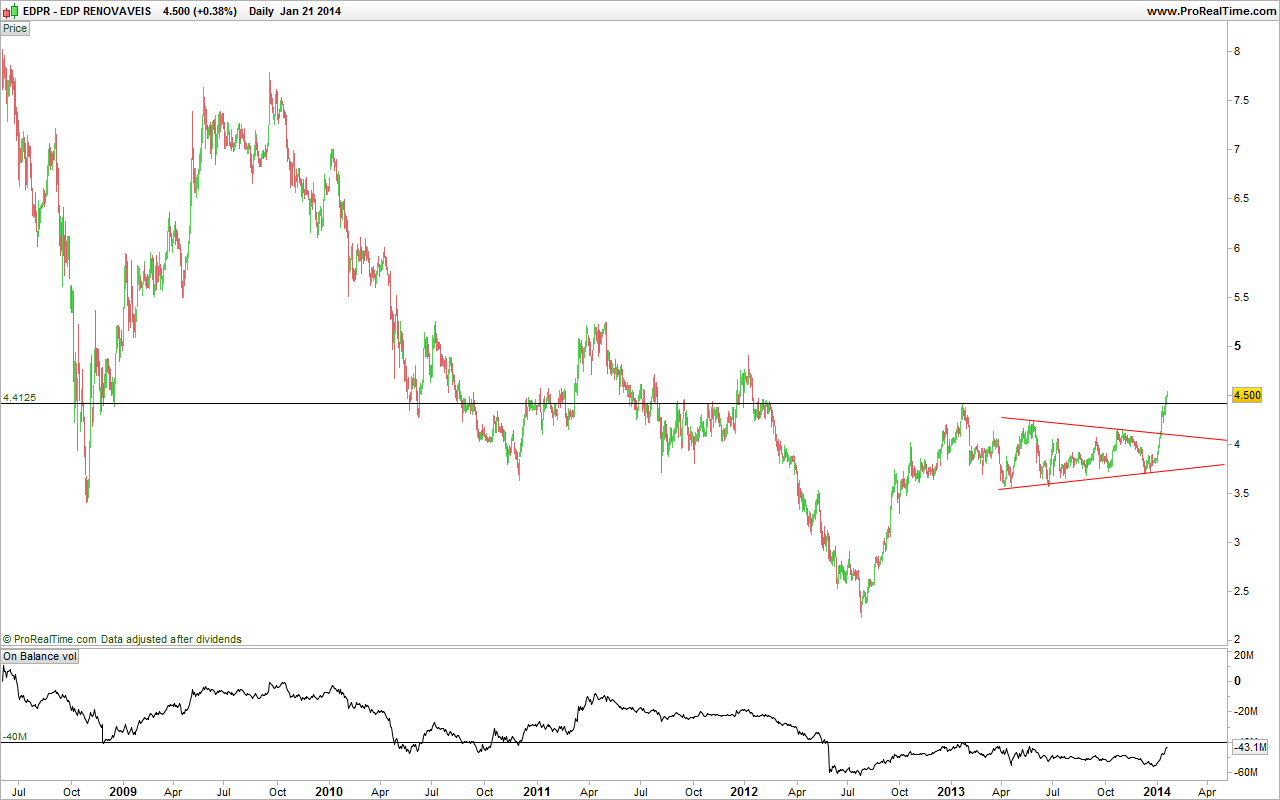 Desde o dia 23 de Dezembro a EDPR apresentou só velas verdes, com duas solitárias excepções. Está a bater na resistência, e os volumes dos últimos dias estão já a diminuir. A minha previsão é que a partir desta 3a feira ou 4a feira a EDPR vai começar a corrigir.