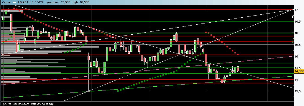 Está a aproximar-se a data da divulgação dos resultados. Se a resistência teimosa dos 14,50€ não for vencida até lá...arrisca-se a ir mesmo até ao suporte dos 13,50€. É a acção mas perigosa de todo o PSI20 nos dias de apresentação de resultados. É normal abrir a perder 6%...7%...8%...9%...10% no dia seguinte aos resultados...mesmo com vendas e lucros a crescer significativamente. Eu sei que se deve comprar no rumor e vender na notícia...mas há limites!