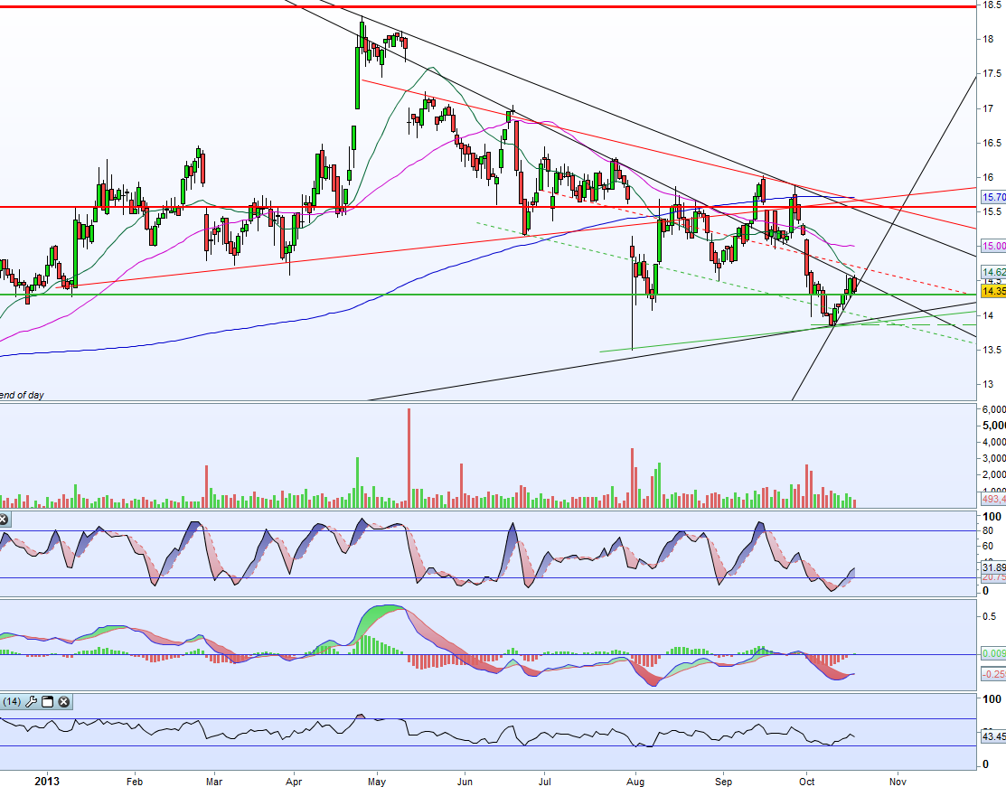 Pelo positivo, tem um suporte 14.35 e a linha desde 2009 que hoje está nos 13.90.