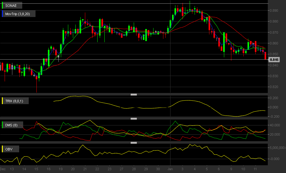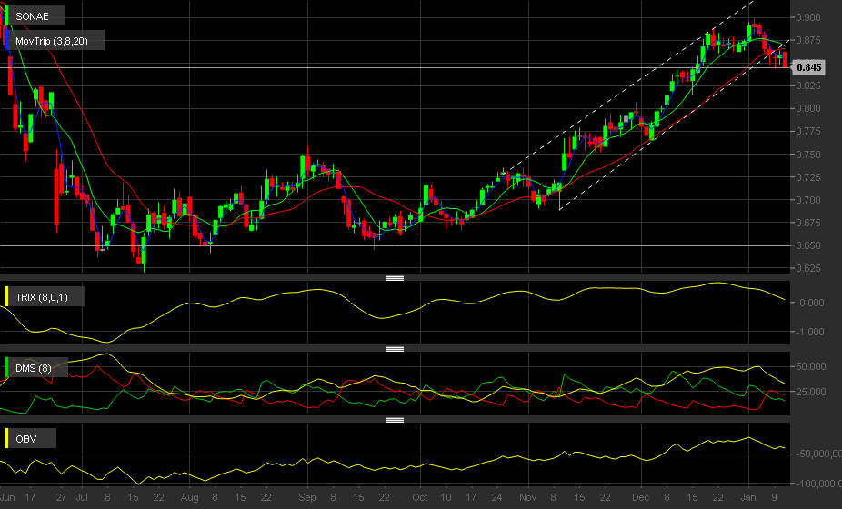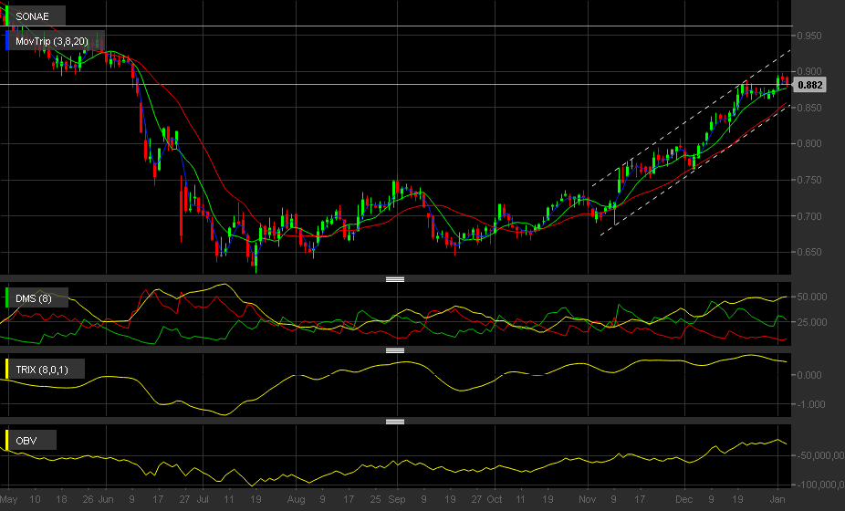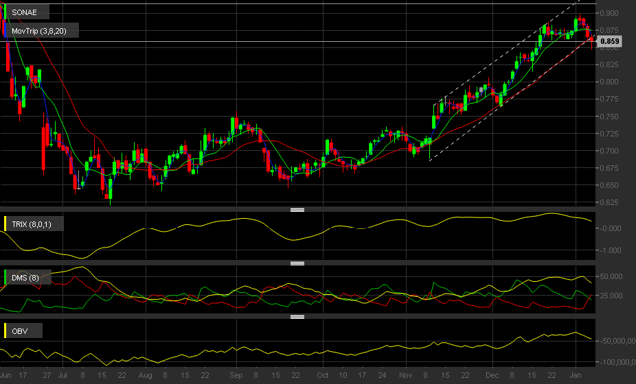 A sonae neste momento ainda está bullish no medio prazo,dentro de um canal ascendente,no entanto começa a dar os primeiros sinais de cansaço,começa existir divergencia negativa no oscilador,obv a sugerir correcao,o adx(bem esticadinho) ainda permaneçe comprado.Não existem ainda condiçoes tecnicas efectivas de venda,teremos de esperar entrar tendencia...mas o gatilho está pronto...