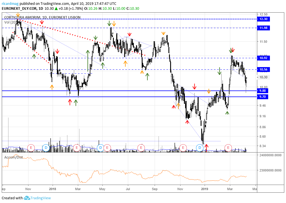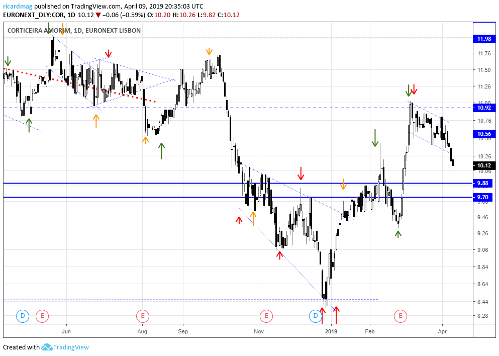 No entanto, a partir do Verão de 2017, a acção iniciou uma correcção e uma tendência descendente. Quem tem acções compradas a menos de 1 euro, não deve estar preocupado por agora terem corrigido dos 13 até à zona dos 10 euros, mas a verdade é que são 2 anos de tendência descendente, num movimento perfeitamente normal depois do autêntico voo rumo à Lua dos anos anteriores.
