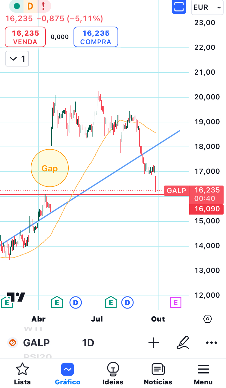 Em relação à Galp, ainda não tenho uma opinião clara sobre a direção que vai ter e por isso não vou dar um palpite. Mas digo que existem ações que fecharam o gap e subiram logo a seguir, outras que não fecharam o gap todo e também subiram, e outras que fecharam o gap e continuaram a descer, tanto em gráficos com dividendos como sem. Não há uma única coisa que aconteça