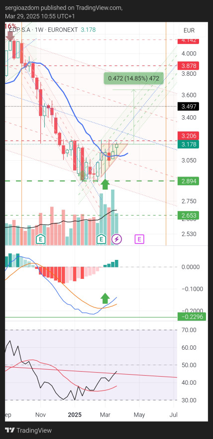O que eu vejo é que a edp caso quebre a zona dos 3.50 tem figura até os 3.80 falta confirmar ...