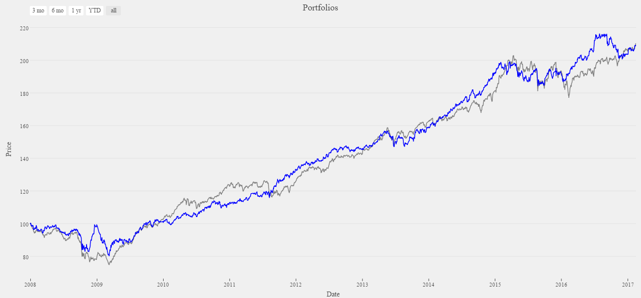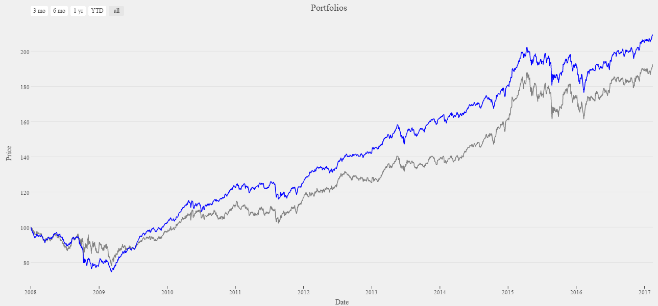 Qual é o meu espanto quando vou comparar a performance e... desde 31/12/2007 a "4 fundos EW" tem 8.5% de rentabilidade anualizada (a cinza) e a SPY/TLT ficou com 8.4% (a azul). Desvios padrões de ambas abaixo dos 10%.