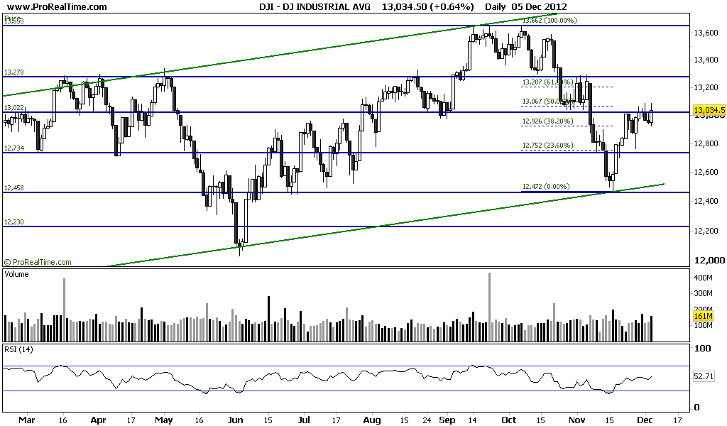 O Dow está numa zona de resistência e está nos 50% de fibo.