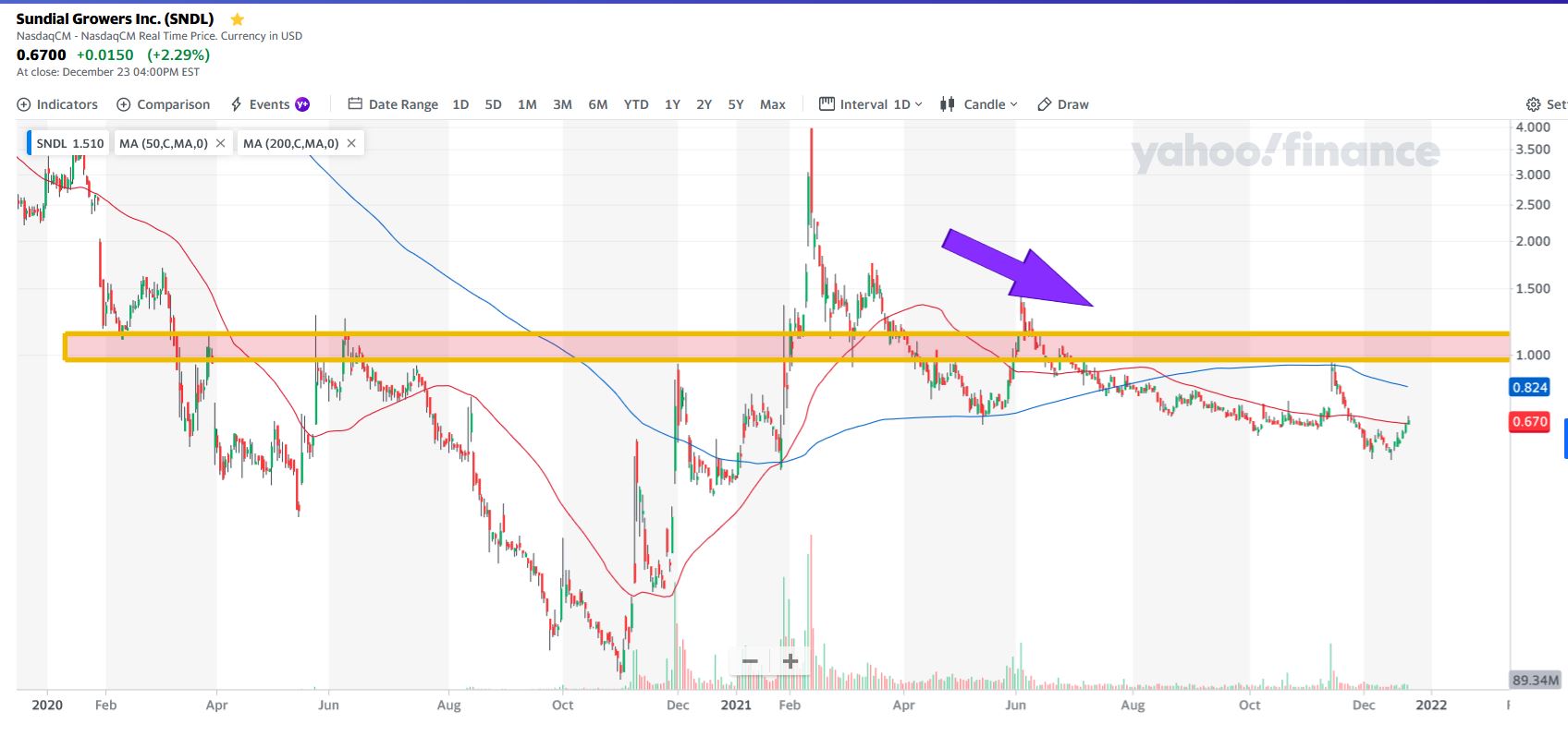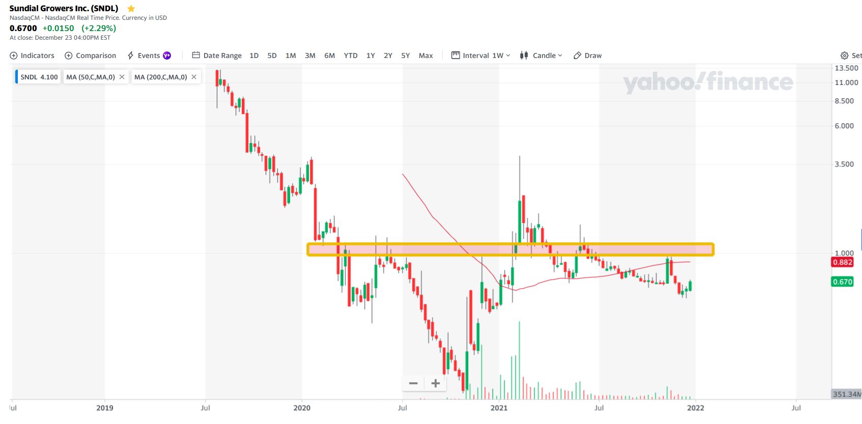 Desde a entrada em bolsa a SNDL caiu sistematicamente tendo atingido os mínimos no fim de 2020 onde cotou na casa de cêntimos (10, 20c etc).