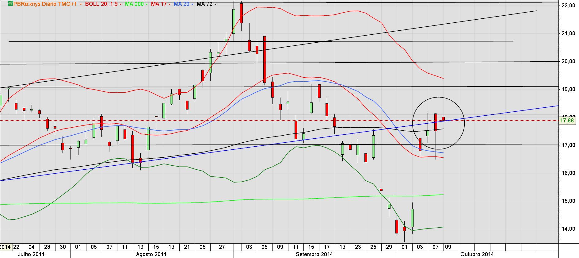 Entrei novamente na PBR.a aos 16,57 nos últimos cinco minutos de sessão. Estava um bocado "arrependido" , neste trade politico de alto risco, pois a Marina acaba de divulgar, hoje domingo o apoio a candidatura de Aécio Neves.