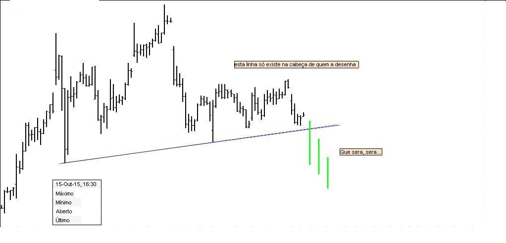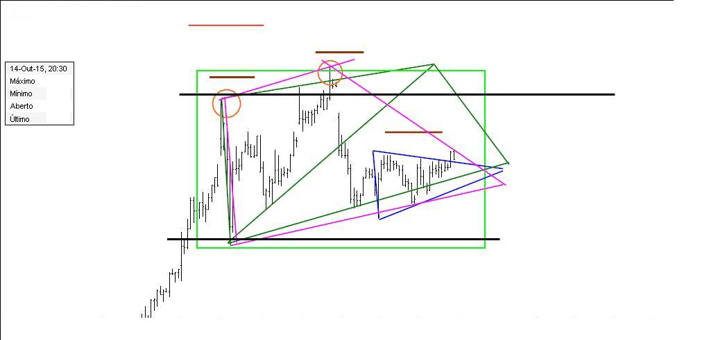 Acrescento que, a partir de agora, torna-se evidente para o mercado qual o padrão que estará a formar. Será um shampoo? Será um diamante? Será um duplo topo, mais ou menos imperfeito (como Adão e Eva)? E que tal um triângulo dentro de um rectângulo, que mais não é do que uma "caixa de exaustão" de Darvas? Serão flags ou pennants (não serão estas "flags corrompidas"? E que tal um canal? Tudo isso e nada disso: apenas compradores e vendedores numa certa zona de preços formando padrões que, antes de o serem, já o eram.