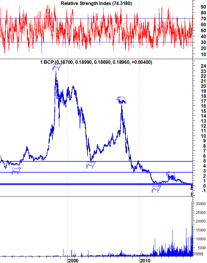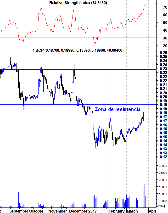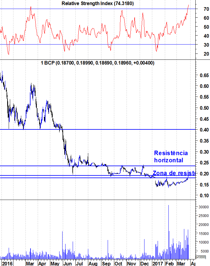 Ulisses Pereira Escreveu:O BCP está agora no limite superior da resistência, com o RSI há níveis apenas atingidos há 3 anos atrás. Tal como ontem no fecho da sessão afirmei, são grandes as probabilidades de uma correcção nesta zona. Ficam os gráficos actualizados.