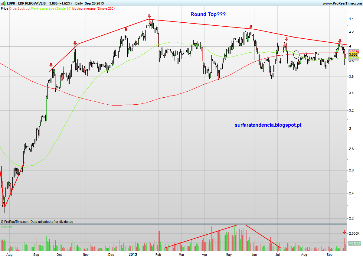 Update gráfico à EDPR. Parece fazer cada vez mais sentido a teoria de round top. Mais um lower-high, confirmado com volume significativo...