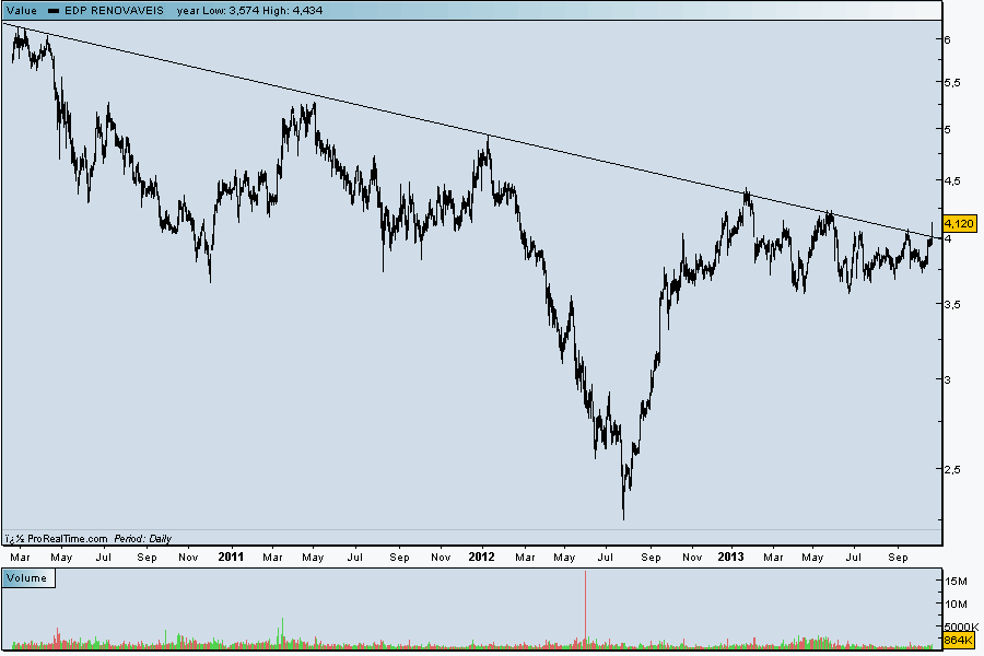 capanga Escreveu:A EDPRenovaveis deixo-me um pouco confuso. Na sexta tentei fazer um trading nela, pois li a noticia dos contratos com os EU e pensei que iria dar um salto. Isso não aconteceu como eu esperava e saltei logo fora. Fiquei com a ideia que essa informação teria incorporado na valorização 2/3 dias antes; e também estava sempre a piscar o olho á PT! Aquilo que tenho reparado é que ela quando cai o seu suporte é superior da ultima queda e penso por isso que agora não passará dos 3,80€...