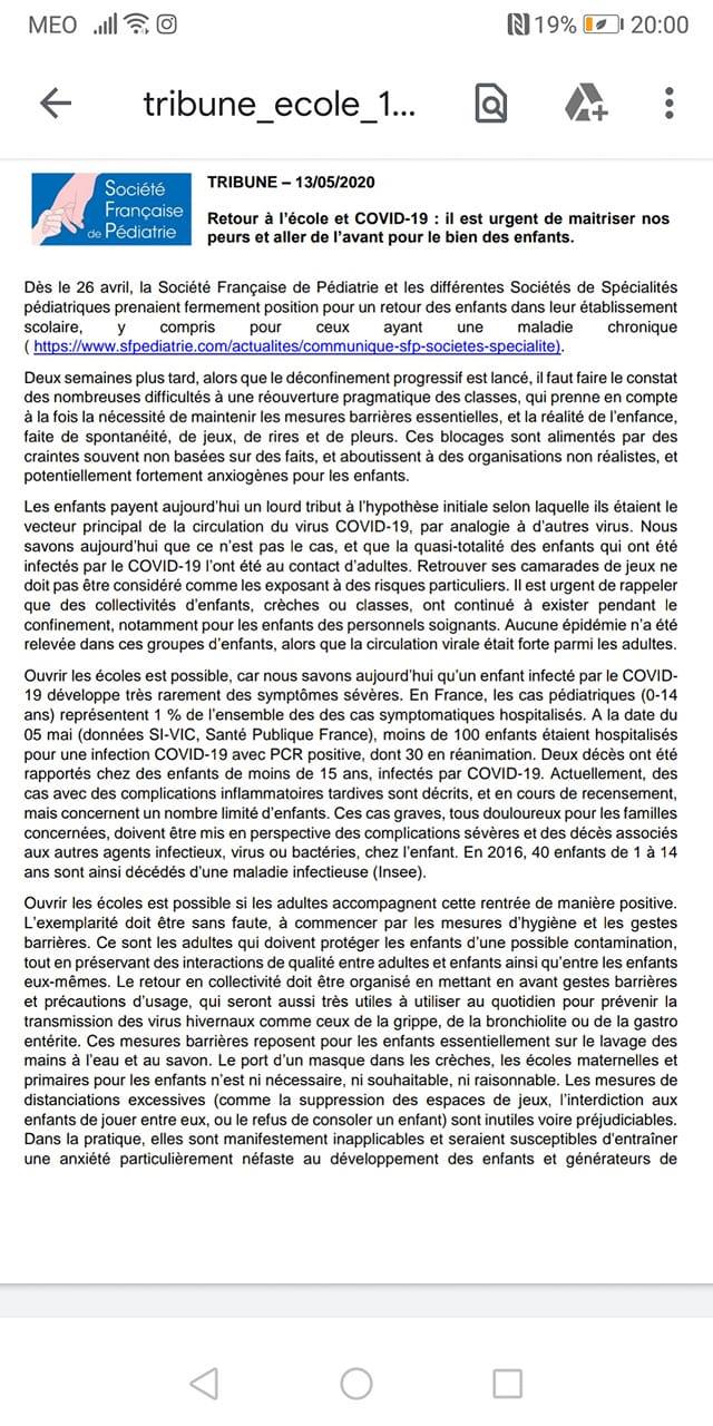"Carta da sociedade francesa de pediatria para as escolas, onde se explica que inicialmente se pensava que as crianças seriam grandes transmissores deste vírus, à semelhança do que acontece com outros, mas que agora se sabe que isto não é verdade. Que as crianças são quase sempre contagiadas pelos adultos e não são grandes transmissores. Explica também que na esmagadora maioria dos casos em que são infectadas não têm sintomas graves e que nas escolas, regras simples de higiene como lavar as mãos são suficientes para as proteger. Regras essas aliás que tb servem de proteção a outros vírus como os da gastroenterite por exemplo. A carta termina dizendo que todas as medidas que prejudiquem a relação com os adultos e entre as crianças serão prejudiciais ao seu desenvolvimento e devem ser evitadas." Texto de Laura Sanches.