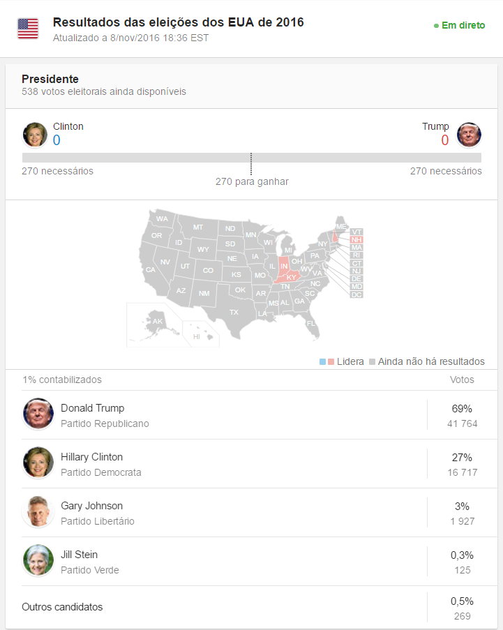 Quimporta Escreveu:Na suposição de que as previsões não se afastam muito da realidade, as eleições devem decidir-se na costa leste e a noite eleitoral pode acabar cedo. Por exemplo caso Trump perca na Florida ou na Carolina N.