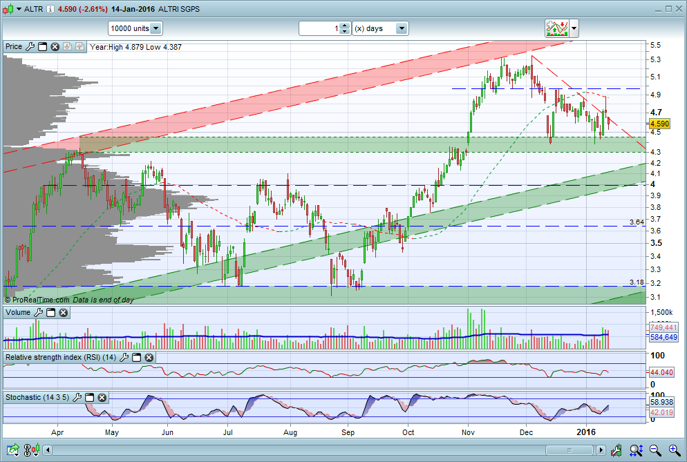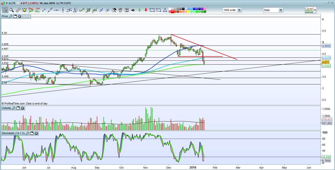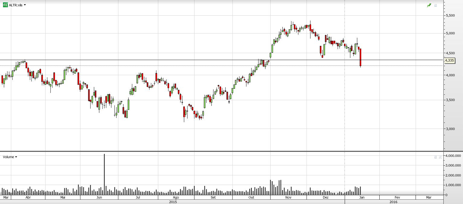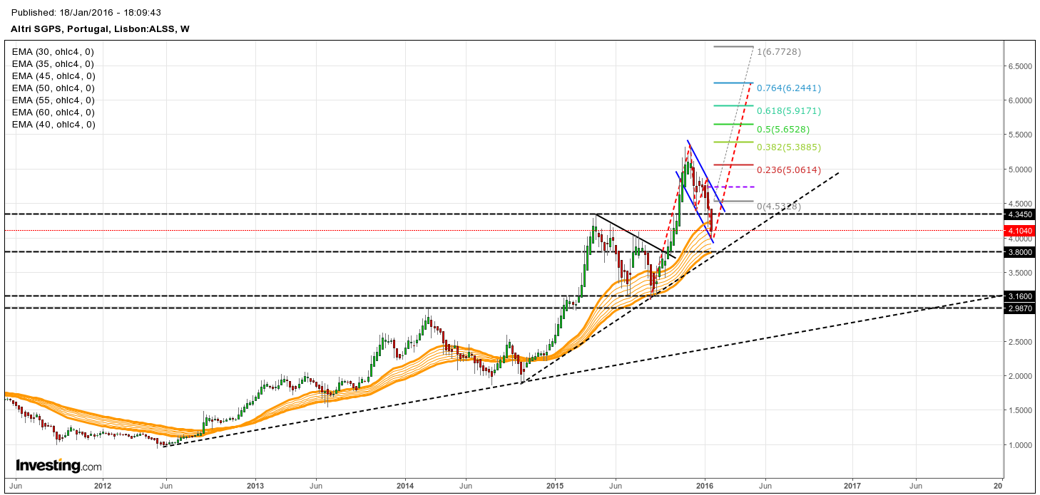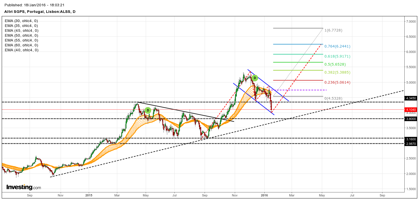 Preço continuará em queda e irá testar a linha ascendente de suporte que já vem desde os finais de 2014, pelo que de seguida continuará a sua trajectória ascendente até à zona dos 4.35, onde retomará as quedas (formando um possível padrão de "Head and Shoulders") até à zona dos 4.20 euros ou mesmo atingindo cotações mais baixas.