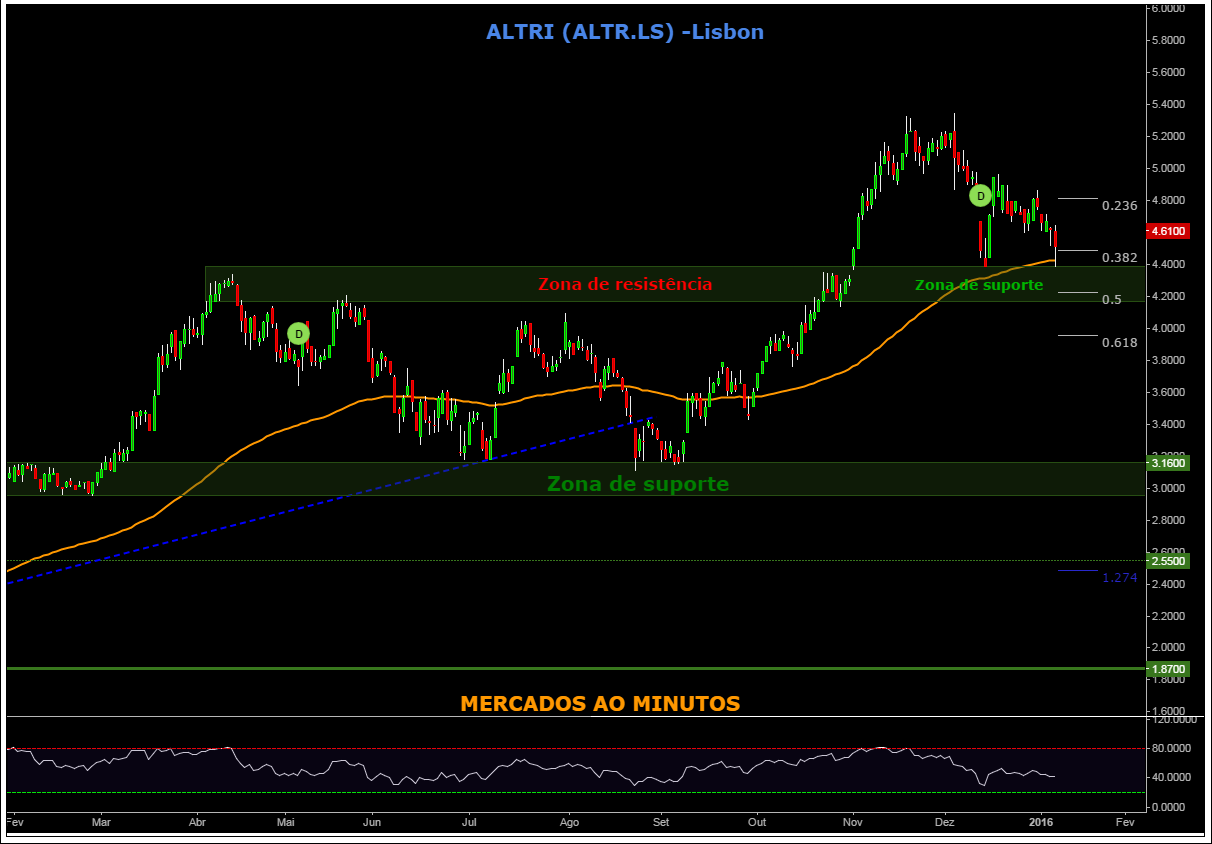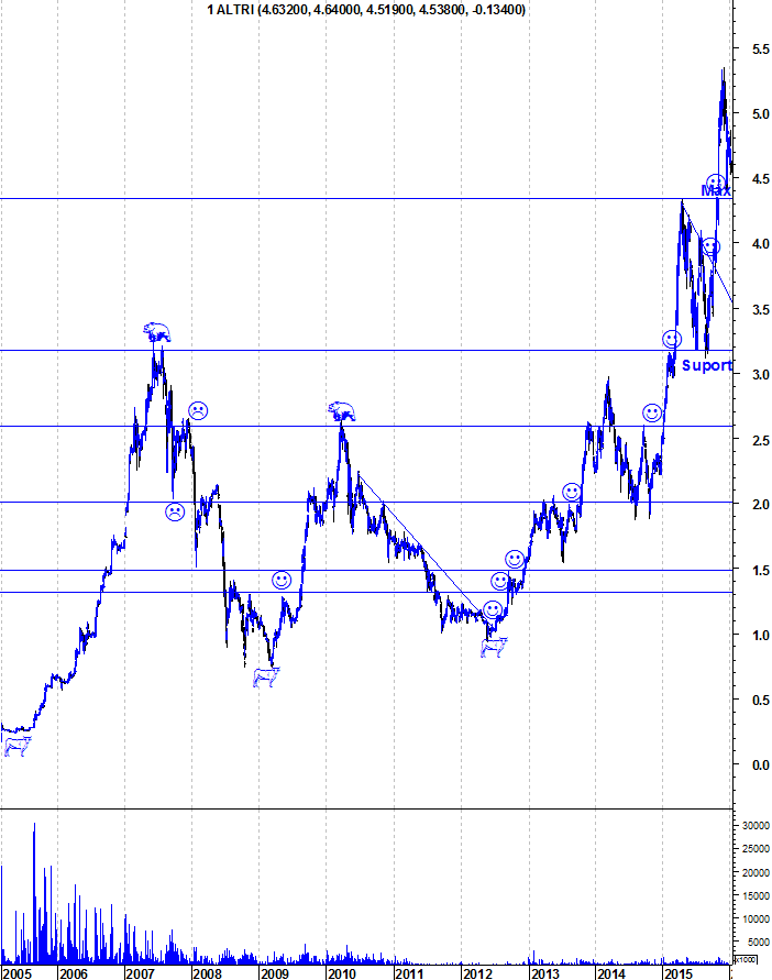 Altri continua a corrigir e vai ser muito interessante assistir ao teste da sua força junto ao suporte dos 4,35 euros. Uma acção que tem mostrado uma força assinalável, com 3 anos e meio de "Bull Market" e que tem reagio bem nas retracções aos suportes. Vamos ver se manterá o padrão.