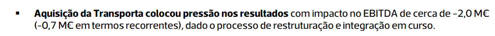 No relatório indica que a reestruturação da transporta teve um impacto no EBITDA de 2 M ( Peanuts em 59 M de EBITDA ) e na queda de 14M para 1 M RL.