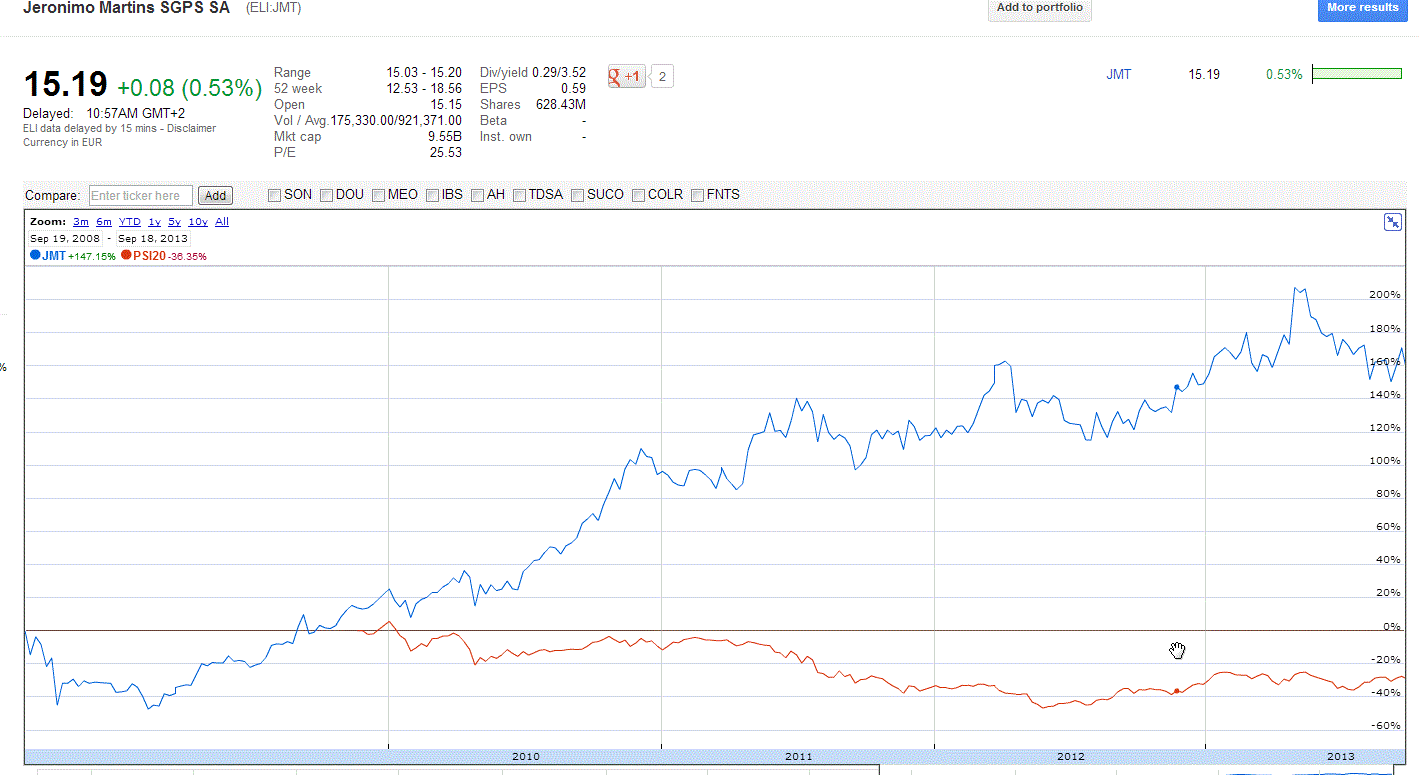 Eu postei o gráfico a 1 ano porque é onde se pode ver melhor esta relação, a JM tem a tendencia de subir mais que o indice em comparação, se aumentares a distancia temporal a diferença entre os dois vai ser afectada exponencialmente. Não pensei que o teu post fosse irónico ou condescendente, mas sempre achei que fosse dado adquirido que as empresas com maior exposição á economia seguissem a tendencia do PSI20, uma vez que são das que têm mais peso no indice.