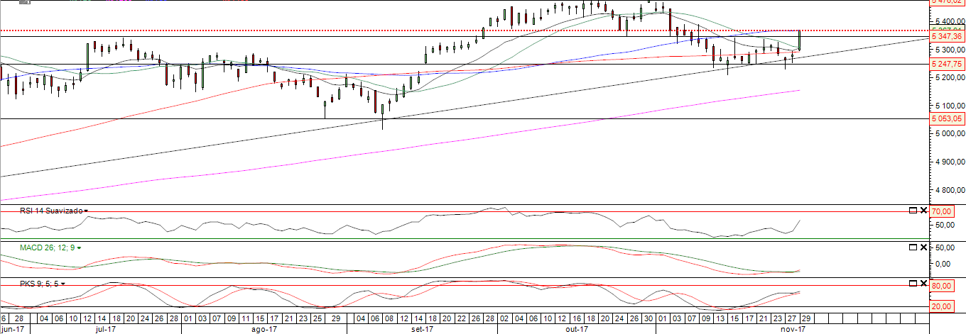 PSI está neste momento a testar a crucial MM50 nos 5366 , vamos ver se consegue ultrapassar esta barreira .