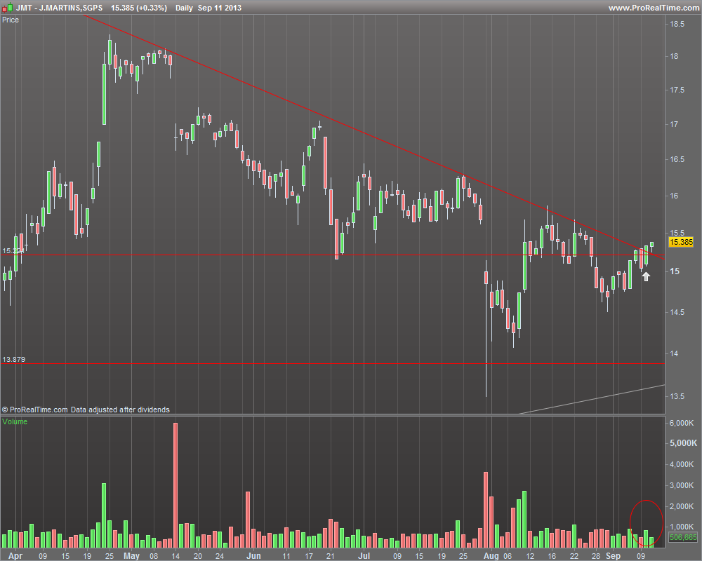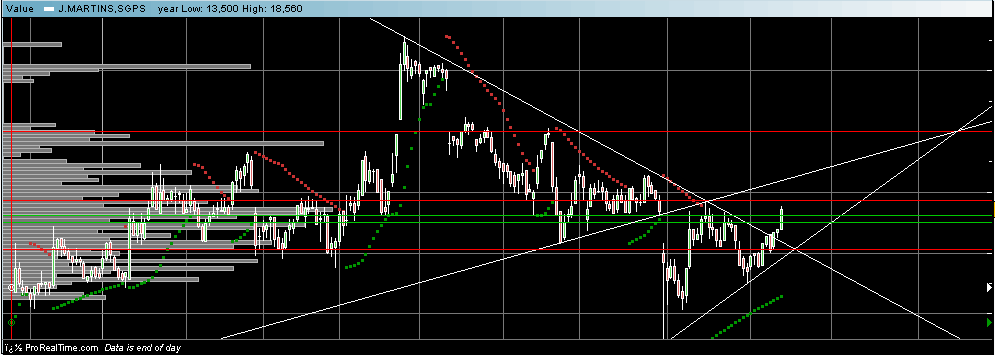 Tens razão e os pontos de saída devem estar sempre bem definidos, por causa das partidas do mercado. Pessoalmente, sinto que na JM as mm 50 e 200 são respeitadas pelo mercado. Assim, a superação da mm50 foi muito positiva e se hoje fechar acima da mm 200 fico francamente otimista.