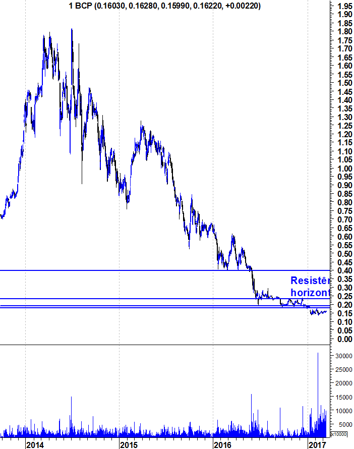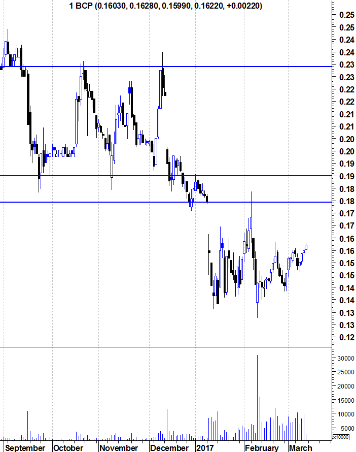 O BCP está com um aspecto de "querer" "saltar" os 0,1600€ definitivamente por aí acima até pelo menos aos 0,1700€ onde já não vai desde 06/02/2017.