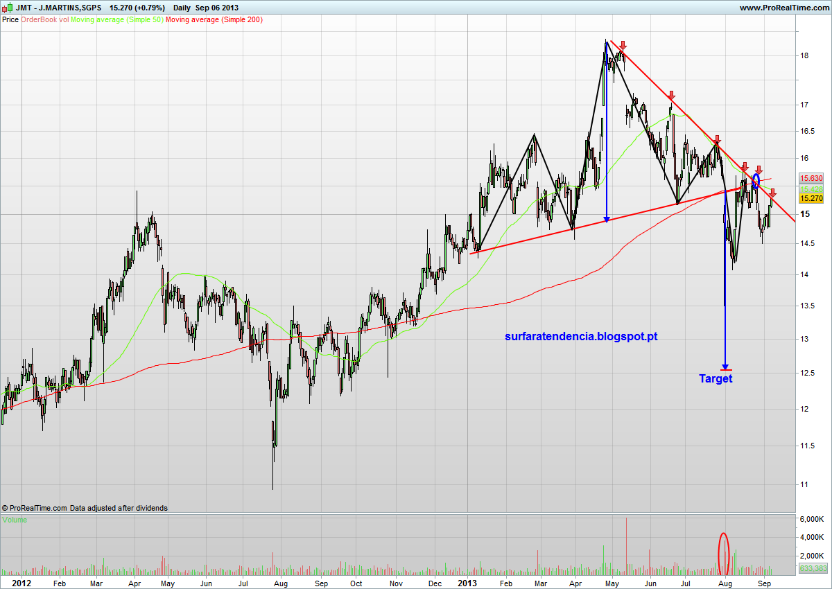 Update gráfico à Jerónimo Martins. Cenário negro em andamento! Um considerável H&S foi activado com volume, deu-se o esperado pullback e até já temos uma linha de tendência a acompanhar o movimento descendente com rigor! Se esta linha não for quebrada em alta amanhã, dando alguns sinais de força aos compradores, as coisas podem ficar feias... Uma posição curta nesta área pode mostrar-se pertinente pois temos a zona de stop (lower-high) a 3% de distância e o target do H&S a 18%. Isso permite a negociação com uma relação perda/ganho de 1/6. Vamos acompanhando...