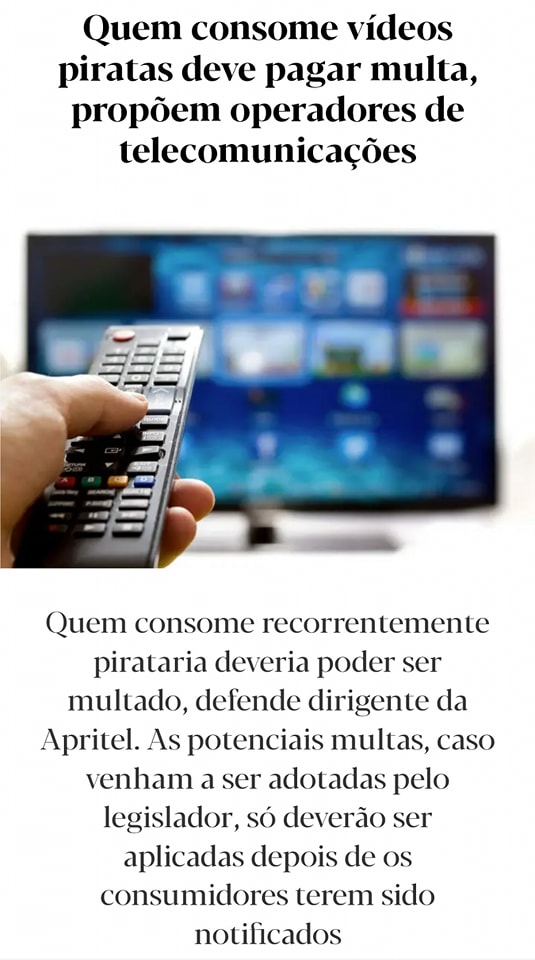 Ainda se lembram das campanhas, de quando em vez, na Comunicação Social, a aterrorizar os consumidores de pirataria (escrita e visual) com penas de prisão? Na opinião da associação do setor, a Apritel, os consumidores de pirataria estariam a cometer um crime de lesa-majestade e sem perdão.