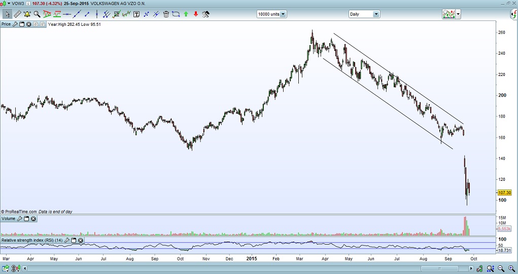 Não sei se já aqui alguém abordou este tema, a VW é um bom exemplo da utilidade da AT e da sua antecipação em relação à AF. Em abril/maio a VW deu os primeiros sinais técnicos de fraqueza, invertendo a tendência de alta em que vinha a negociar até aí e passando a negociar numa tendência clara de queda. Também é um bom exemplo dos perigos que corre quem está investido em títulos com este padrão técnico, mesmo quando os fundamentais parecem sólidos. Os accionistas do BCP deviam olhar para este exemplo!