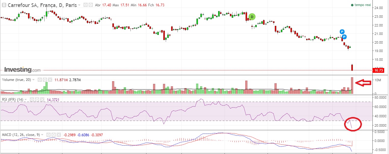 O gráfico está com muito mau aspecto, com enorme volume na queda e RSI sobrevendido.