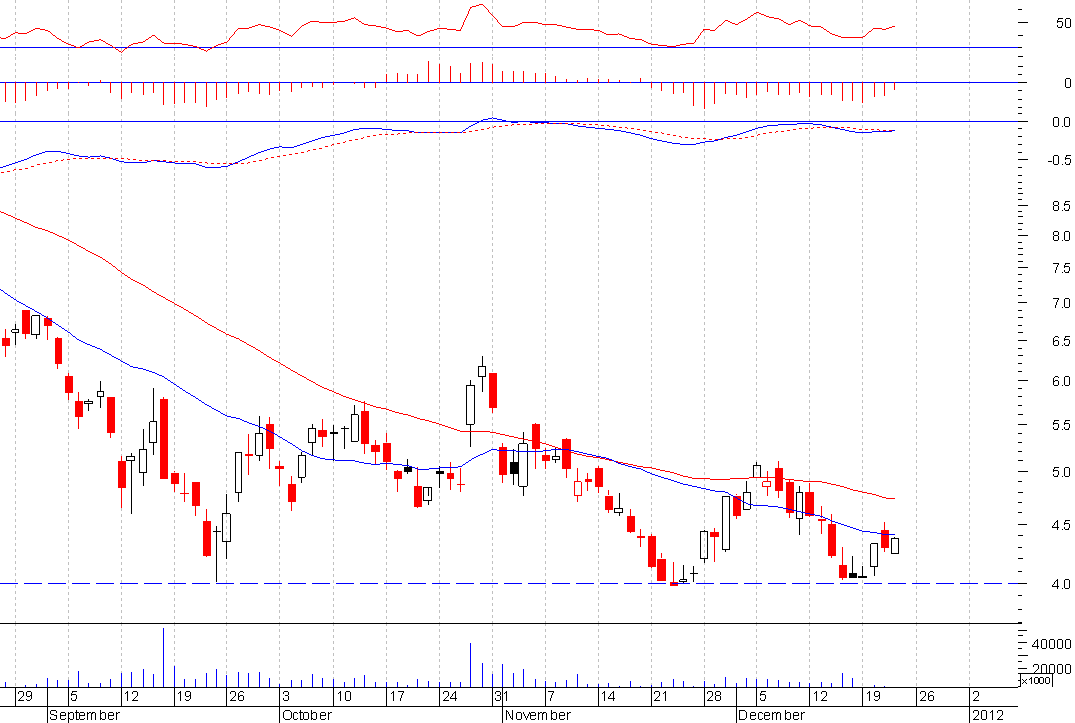 vejo uma tendência descendente de longo prazo (notar que em Junho o título fez os seus mínimos de sempre) mas com alguns sinais que mostram vontade de subir, nomeadamente a passagem para cima da mm200 e a mm50 ascendente.