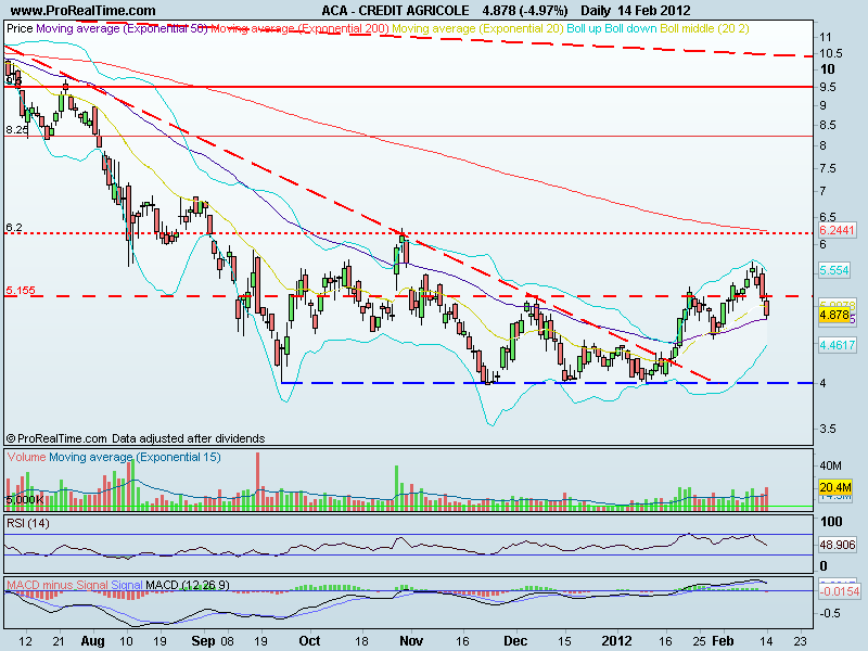 A Credit Agricole está a fazer um pullback aos 5€, o que me parece um bom ponto de entrada para um longo com objectivo de curto prazo nos 6€.