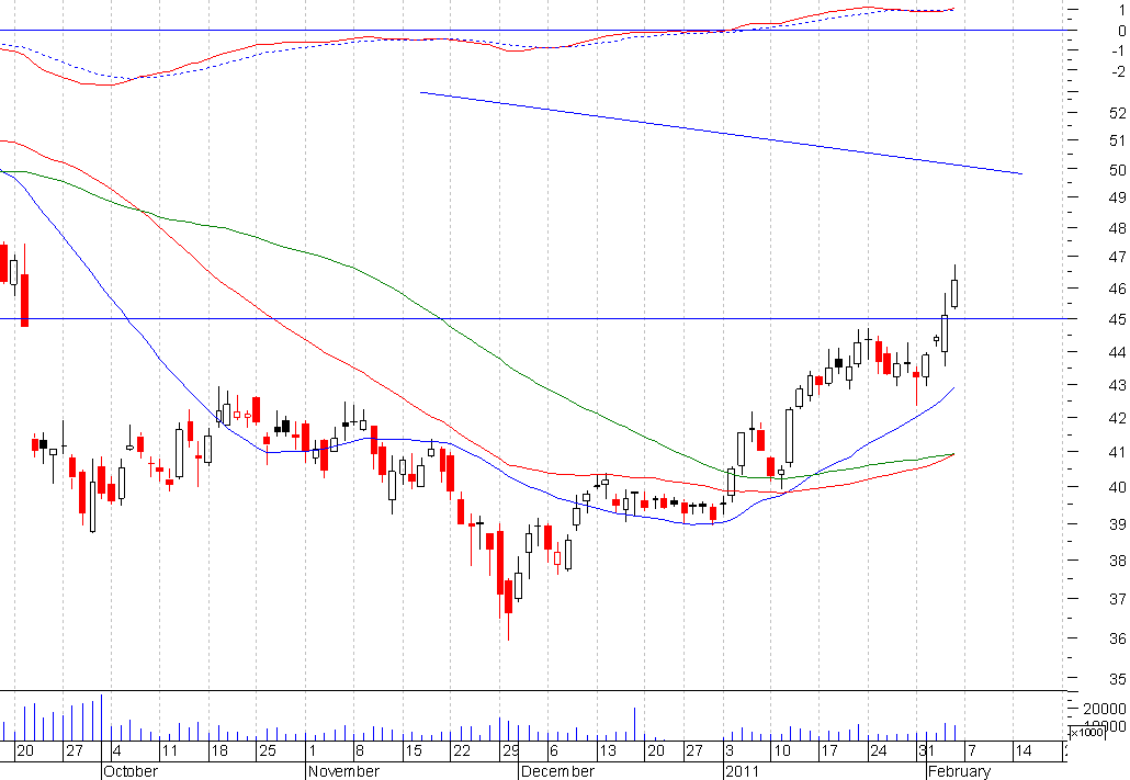 Por outro lado, uma eventual ruptura em alta da LTD (actualmente nos 44 euros) tornaria a situação mais interessante para a tomada de posições longas.