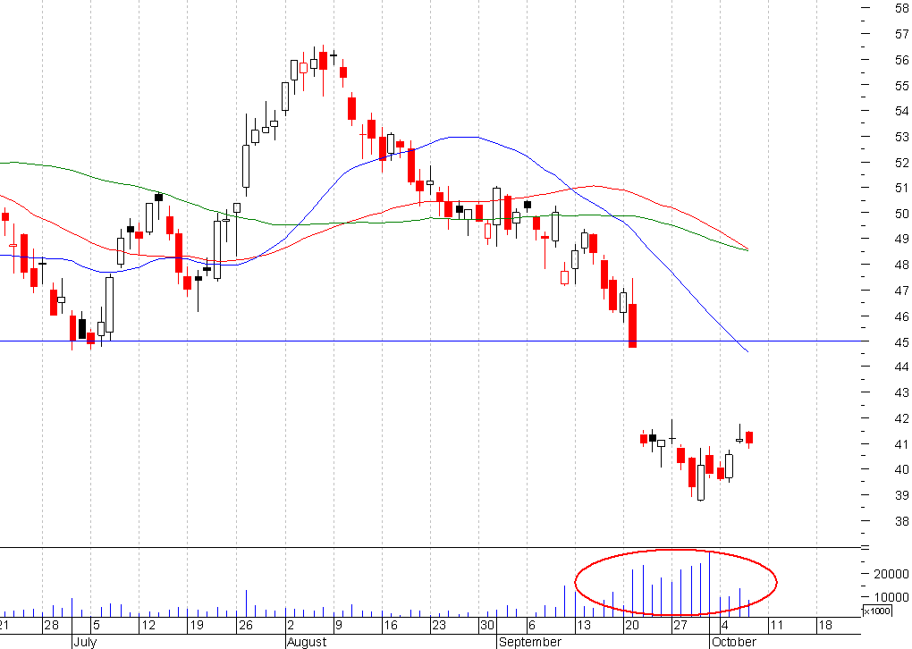 Desde que anunciou um aumento de capital, este título encontra-se numa situação técnica pouco favorável, devido à queda de cerca de 9% no dia 22 de Setembro, na sequência do anúncio. De então para cá a cotação tem variado sobretudo no intervalo [39-41]. Destaque para o volume, que se tem mantido consistentemente elevado (círculo a vermelho na barra inferior), o que sugere que o mercado ainda não incorporou totalmente a perspectiva do aumento de capital.