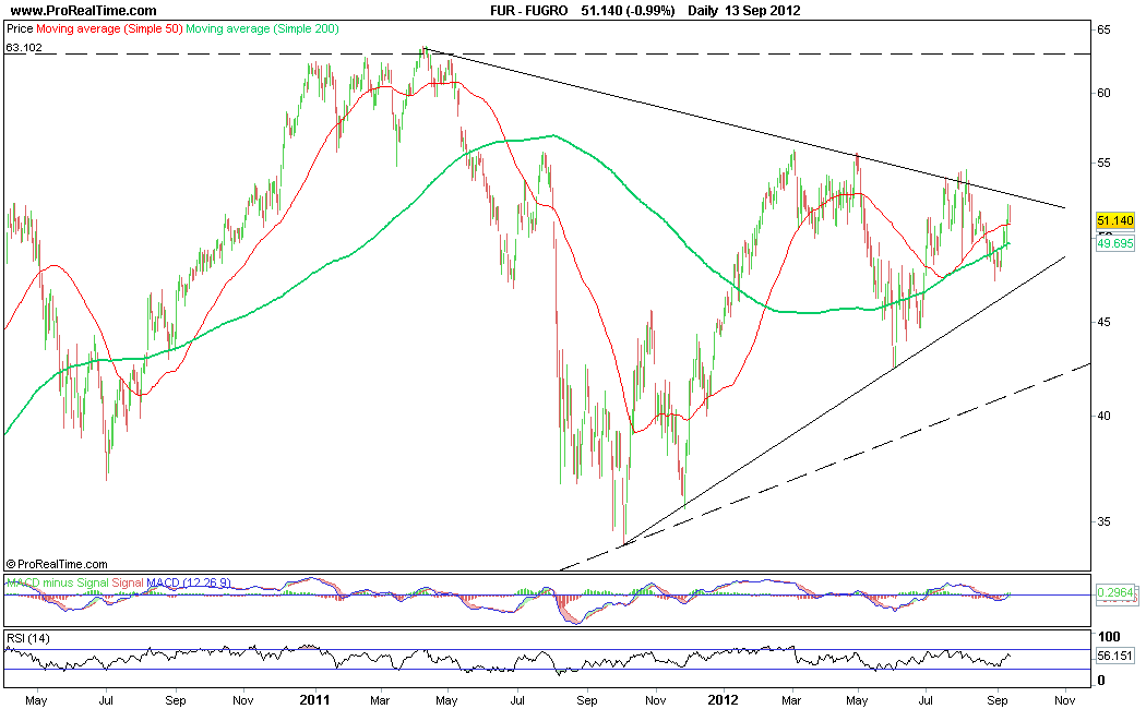 Na sessão de hoje a Fugro avançou mais um passo na confirmação da quebra em alta da sua zona de resistência de curto prazo dos € 30,00.