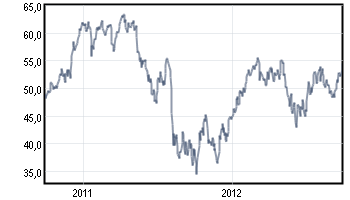A próxima resistência significativa deverá andar pelos 55,5 ou 56 (máximos de Julho de 2011).
