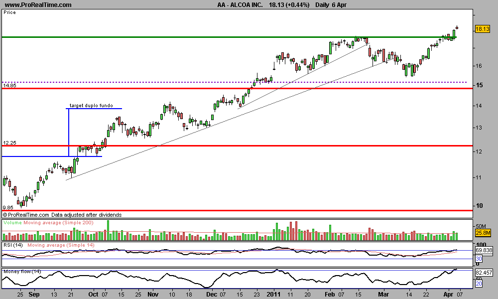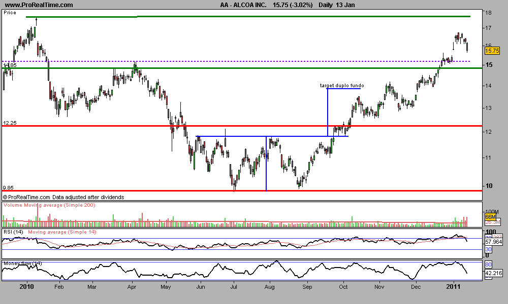 Obrigado pela análise. Cumptspaubo Escreveu:A Alcoa têm tido um comportamento brilhante desde Agosto de 2010. Valorizou aproximadamente 70% o que equivale a um ganho de 6,80 USD.