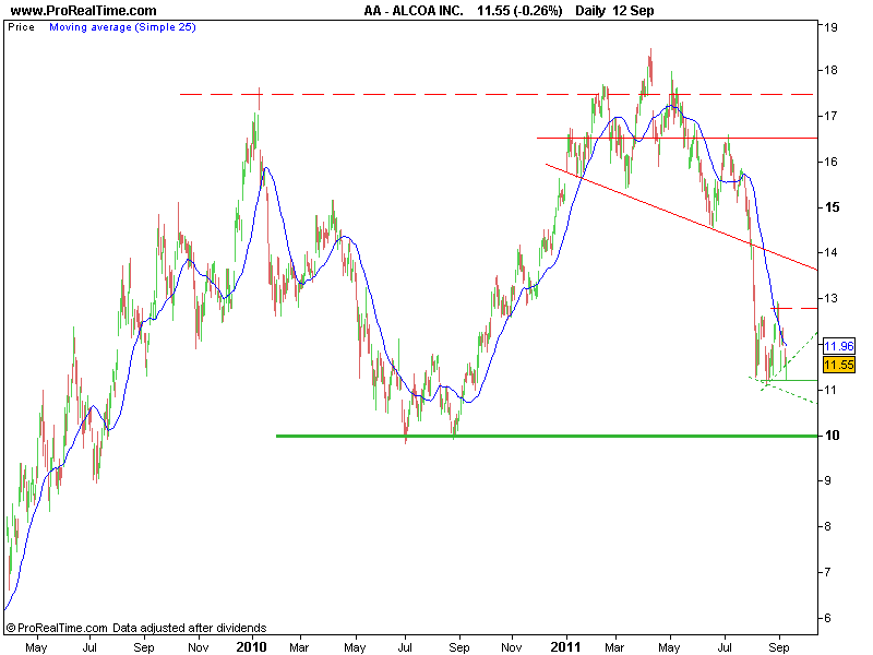 Por outro lado, em caso de quebra dos 11,20 deve ser vigiado o importante suporte dos 10 USD (assinalado no primeiro gráfico), correspondente ao mínimo de Julho de 2010. Se este quebrar a Alcoa fica numa situação muito bearish e uma visita aos mínimos de 2009 torna-se provável.