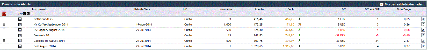 Após o fecho de algumas posições no dia de hoje (ouro, cobre, AEX e SP500) fica a carteira com as posições em aberto e respectivas valorizações/desvalorizações: