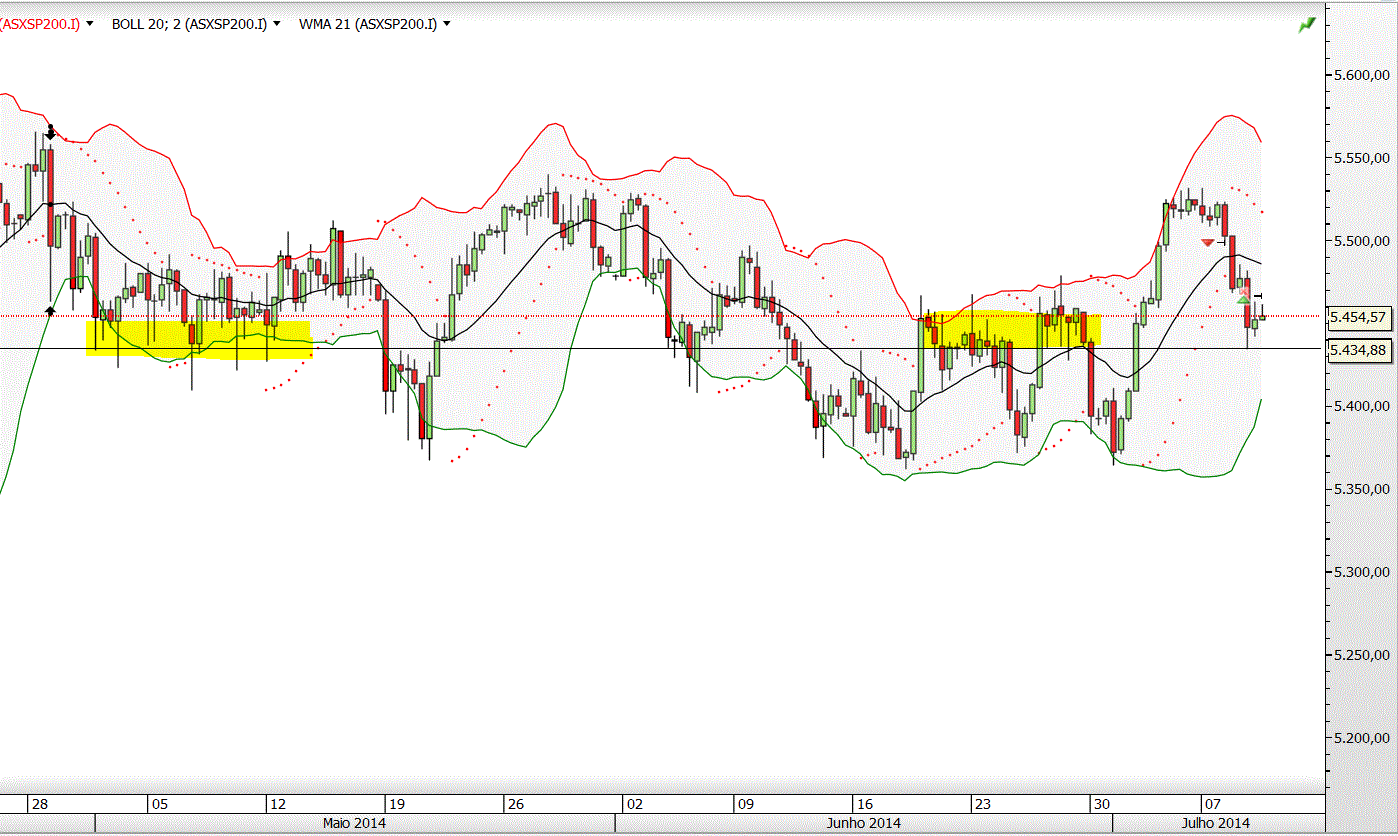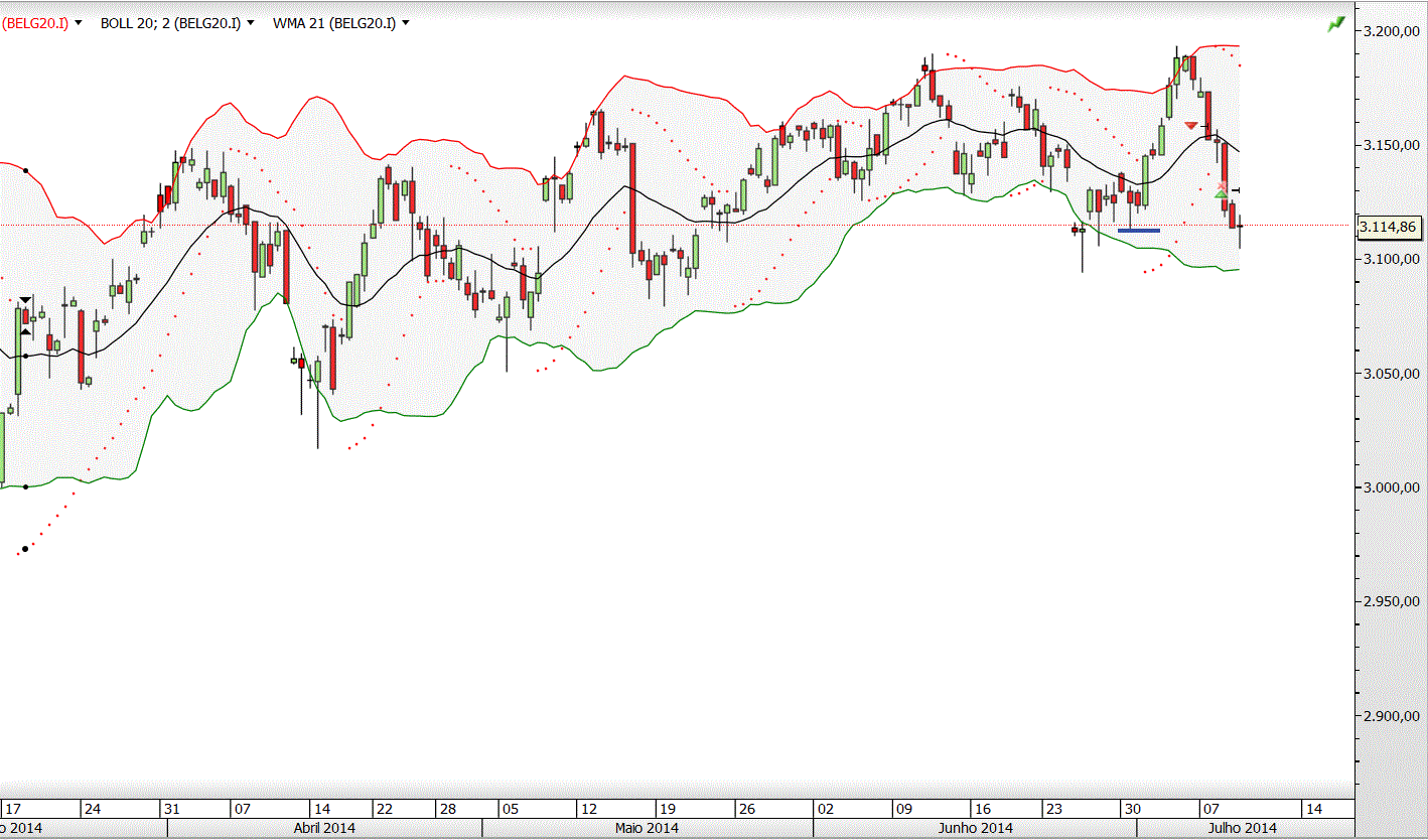 Normalmente, em bull market, o rompimento das bandas de bollinger dá-se pela superior e não pela inferior.