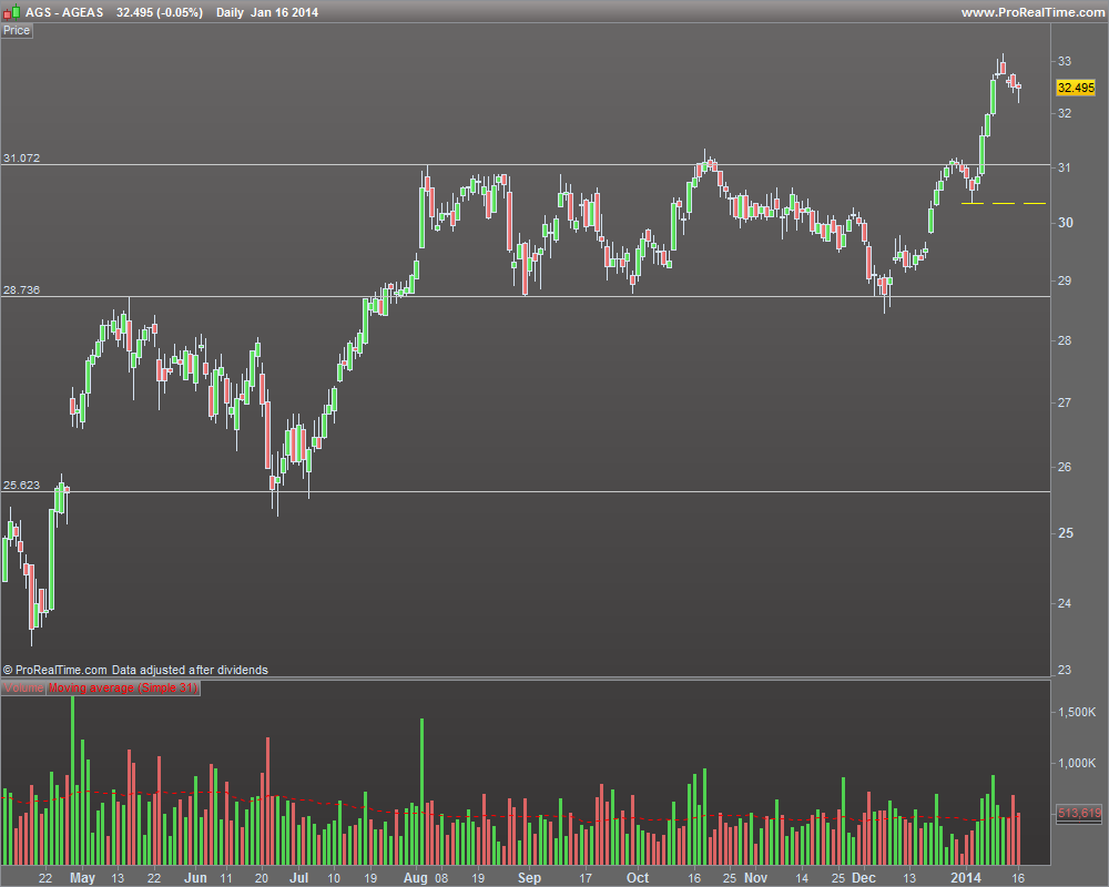 A liquidez já tem destino: ordem dada para compra de Ageas (BEL20). O stop fica nos 30.37, último mínimo relativo, abaixo da resistência dos 31€. Já tinha falado da minha visão sobre este papel num post anterior e a correção ligeira dos últimos dias (que trás a ação para perto do suporte), associada ao martelo formado hoje parecem-me um ponto de entrada aceitável. Distância ao stop 6,5% (a valores de fecho de hoje) e caso satisfeita a posição valerá um bocadinho mais de 7% da carteira.