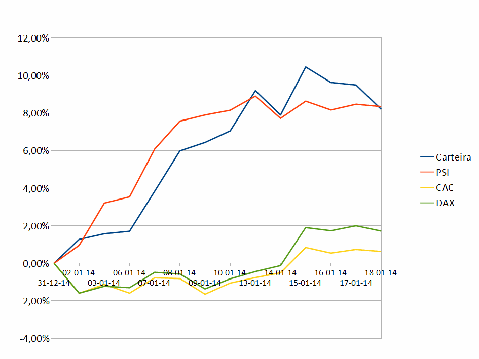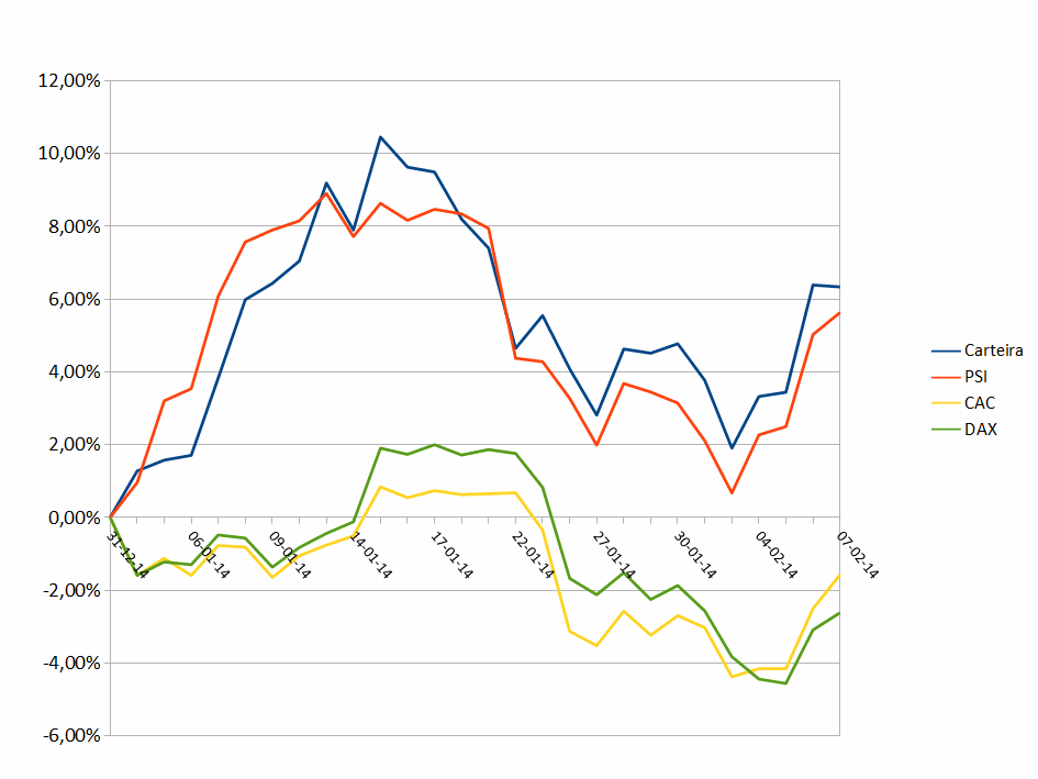 Já tinha dito num post anterior que tanto o BCP como o BES tinham ultrapassado o meu stop, tendo-os eu mantido em carteira. Pois a esses somaram-se neste período a Infineon, a Mota-Engil e a Royal Imtech. 5 stops não respeitado em 11 posições... so much for discipline... Apenas a Arcelormittal foi vendida neste período. Estou algo indeciso em relação a esta temática. Se por um lado reconheci no final de 2013 a necessidade de ir subindo stops com mais frequência para travar os trades inconsequentes (fator já abordado em vários posts) - e essa é uma necessidade que continuo a considerar válida - por outro julgo que a urgência em cumprir esse desiderato me levou a subir alguns stops de forma demasiado apressada e a não os respeitar na "hora H" em consequência. O drawdown registado pela carteira neste período (de um máximo de 10,45% de lucro para 1,9%) é bem expressivo que alguma coisa tem que melhorar na minha estratégia para os stops. Acredito que este aspeto é neste momento aquele em que tenho de longe mais dificuldades no trading. E mais uma vez fica o registo de uma notória falta de disciplina.