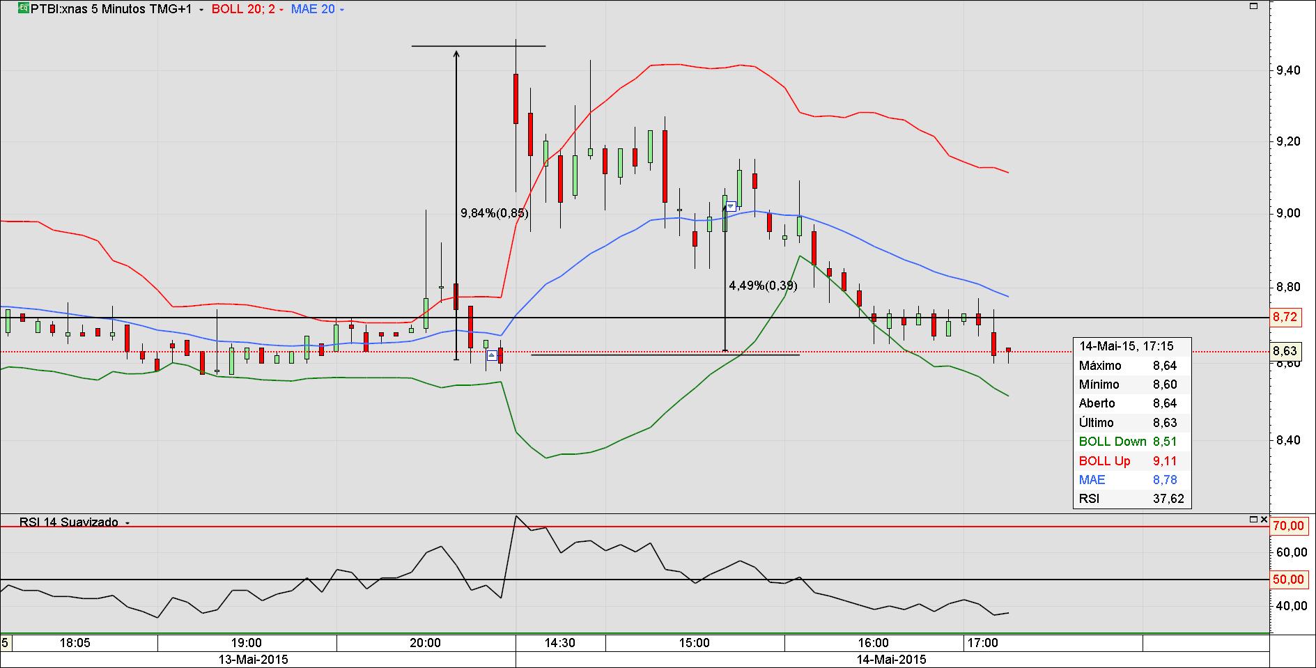 O conteúdo do Soros já deu o que tinha a dar aqui na entrada de fim de dia na PTBI a 8.62 com um stop gain do tamanho da primeira vela do gráfico em 5 minutos. Na segunda vela se arrancar prá baixo e picar acima mantem até voltar e fechar posição. Pretende-se alguns percentuais sobre 3%, pra baixo ou acima. Stop para ambos os lados. Com o gráfico dos 1 minuto acompanhamos os gráficos de cinco minutos, entretanto já estamos informados que vai pra baixo aos 7 usd, porem na primeira vela jaz o stop gain.
