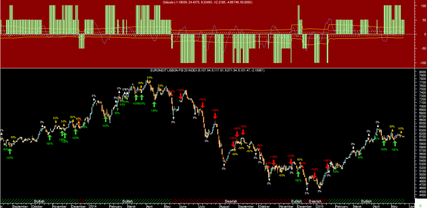 Entretanto deixo ficar de novo um gráfico atualizado do PSI, desta vez com a triste particularidade do novo sistema de trading anunciar o final deste bull market, ou se quiserem duma breve primavera, que terá durado apenas 4 meses.