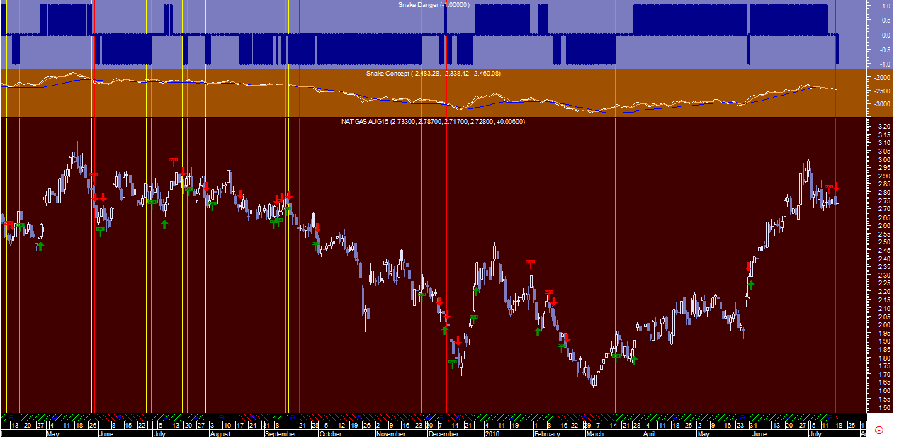 A razão deste aparente paradoxo deve-se ao facto da componente interna de lateralização do sistema de trading ter gerado uma ponderação muito semelhante em relação à sua componente tendencial na atual configuração do Gás Natural, gerando de uma forma simplista um sinal de neutralidade dado pela seguinte condição: 50% x posicionamento lateralizado de compra na base do swing + 50% x posicionamento tendencial vendido no respetivo canal descendente = indecisão ou posição neutral.