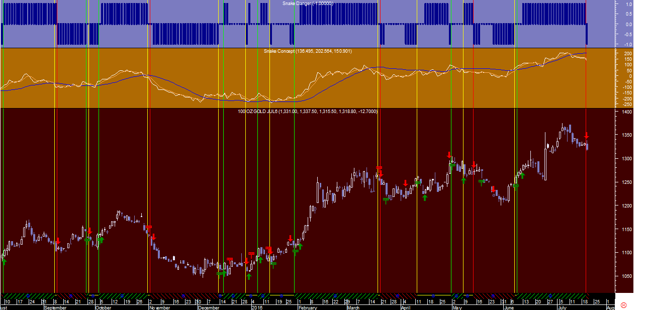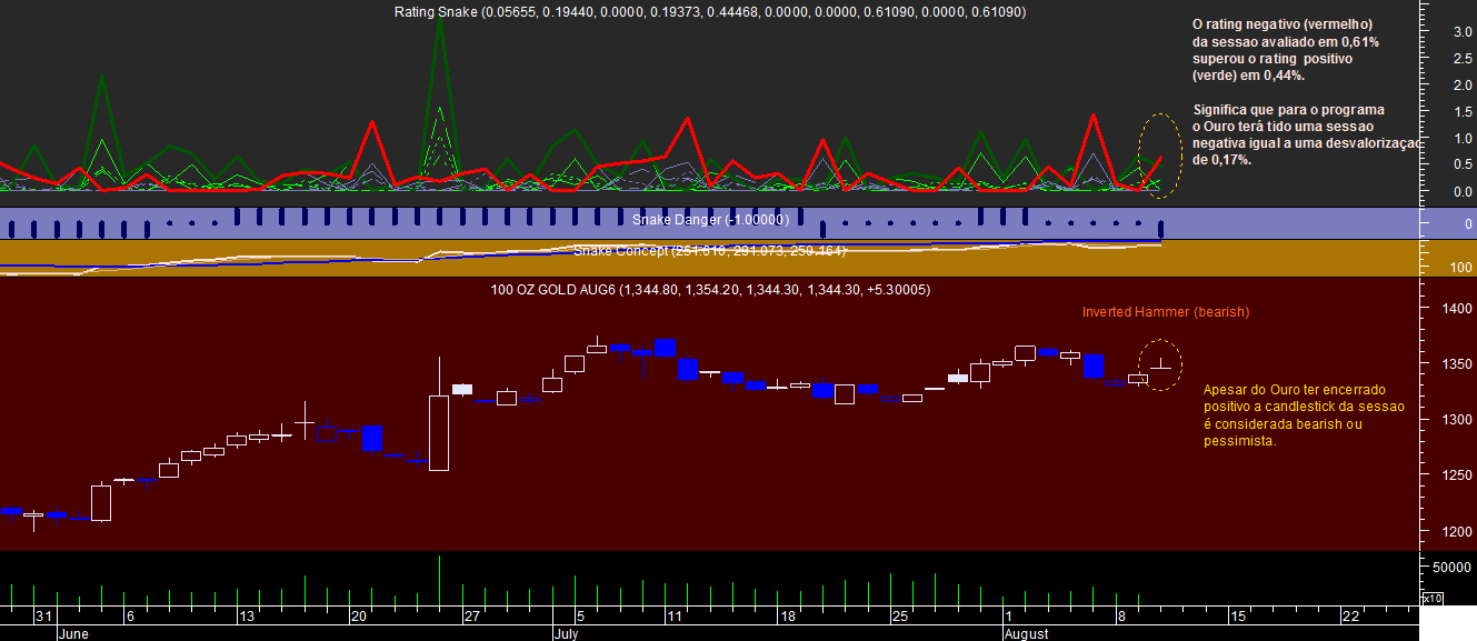 No gráfico do Ouro acrescentei hoje na parte superior o tal indicador chave do sistema de trading chamado “Rating Snake”, que analisa essencialmente as 2 vertentes do problema: o rating otimista, indicado pelo indicador verde bold e o rating pessimista marcado pelo indicador vermelho bold.
