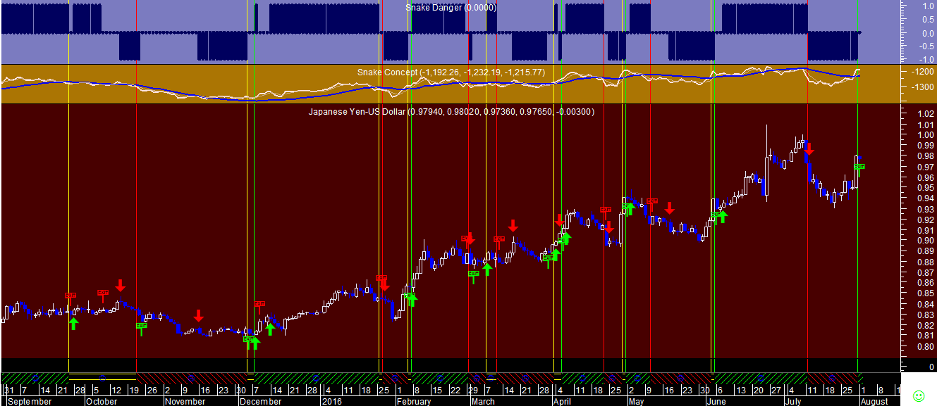 O sentido do indicador azul, que mostra o caminho provável a seguir pelo mercado, vai estando em conformidade com o tipo de regime tendencial e o indicador branco, que se adapta sensivelmente às cotaçoes do JPYUSD, passou bem acima do caminho previsto pelo indicador azul o que só vem reforçar ainda mais que existe uma grande probabilidade da tendência ascendente se vir a manter estável nos próximos dias.