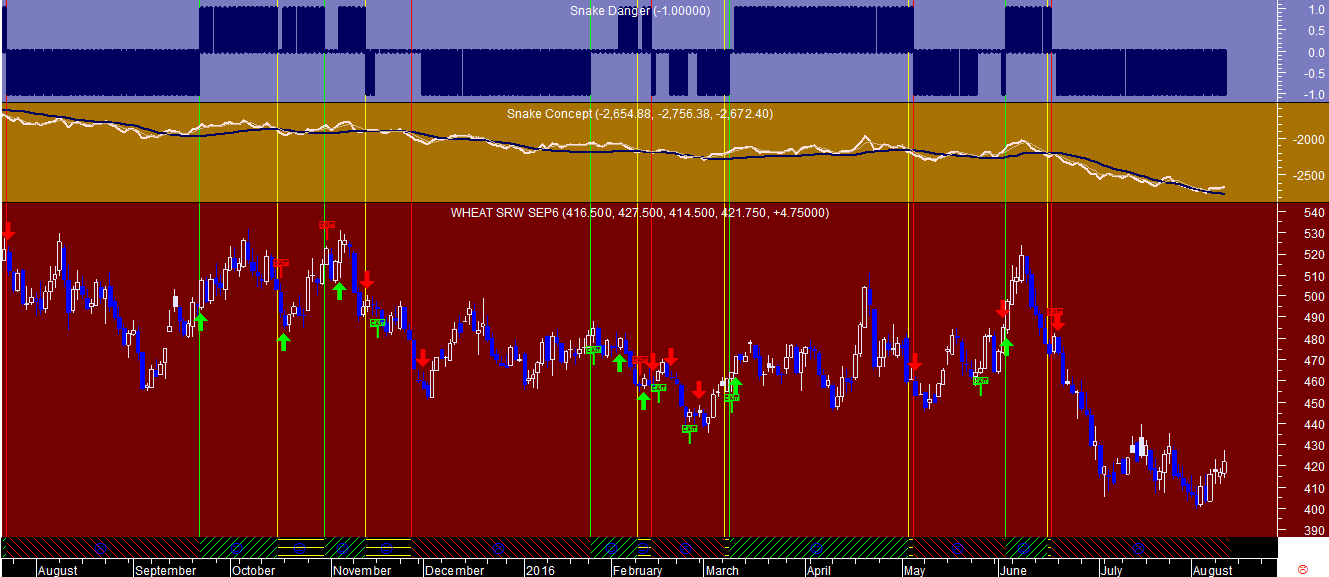 O Trigo na ótica da “Cobra” continua vendido e vai indo bem martelado para baixo nos indicadores apesar dos ameaços de algumas tentativas de recuperaçao da cotaçao nos últimos dias, já que o indicador azul que procura prever o sentido do movimento da cotaçao dos próximos dias continua a apontar convictamente para sul.