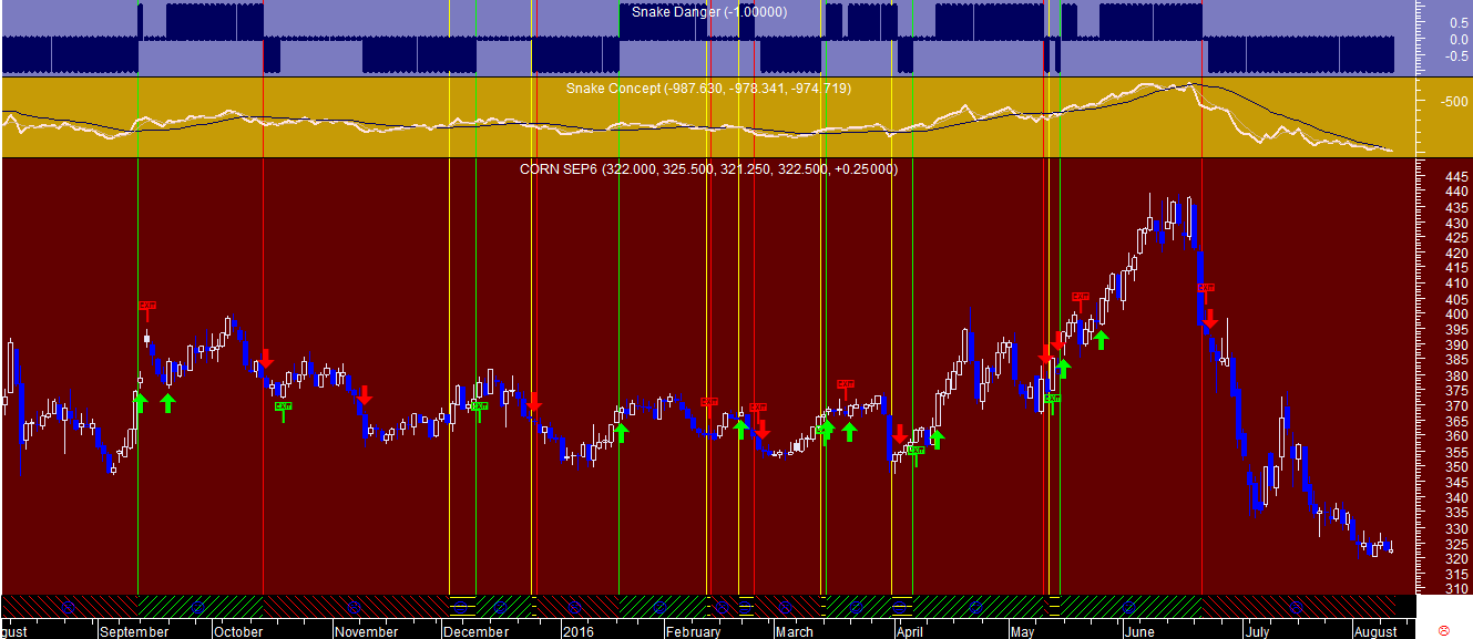 A primeira delas diz respeito à passagem de uma posição neutra para curta ou vendida nos futuros do Milho (Corn), através da combinação dum sinal de venda que se vai mantendo na escala diária e da passagem de comprado para neutro na escala semanal.