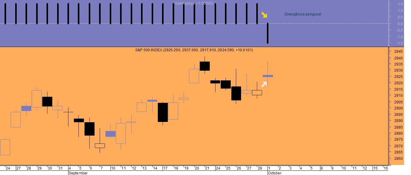 Tal divergência deve-se a um sobreaquecimento no indicador principal tendencial, que ultrapassa a capacidade relativa do mercado poder aguentar por muito mais tempo as subidas ocorridas nos últimos meses no índice S&P 500.